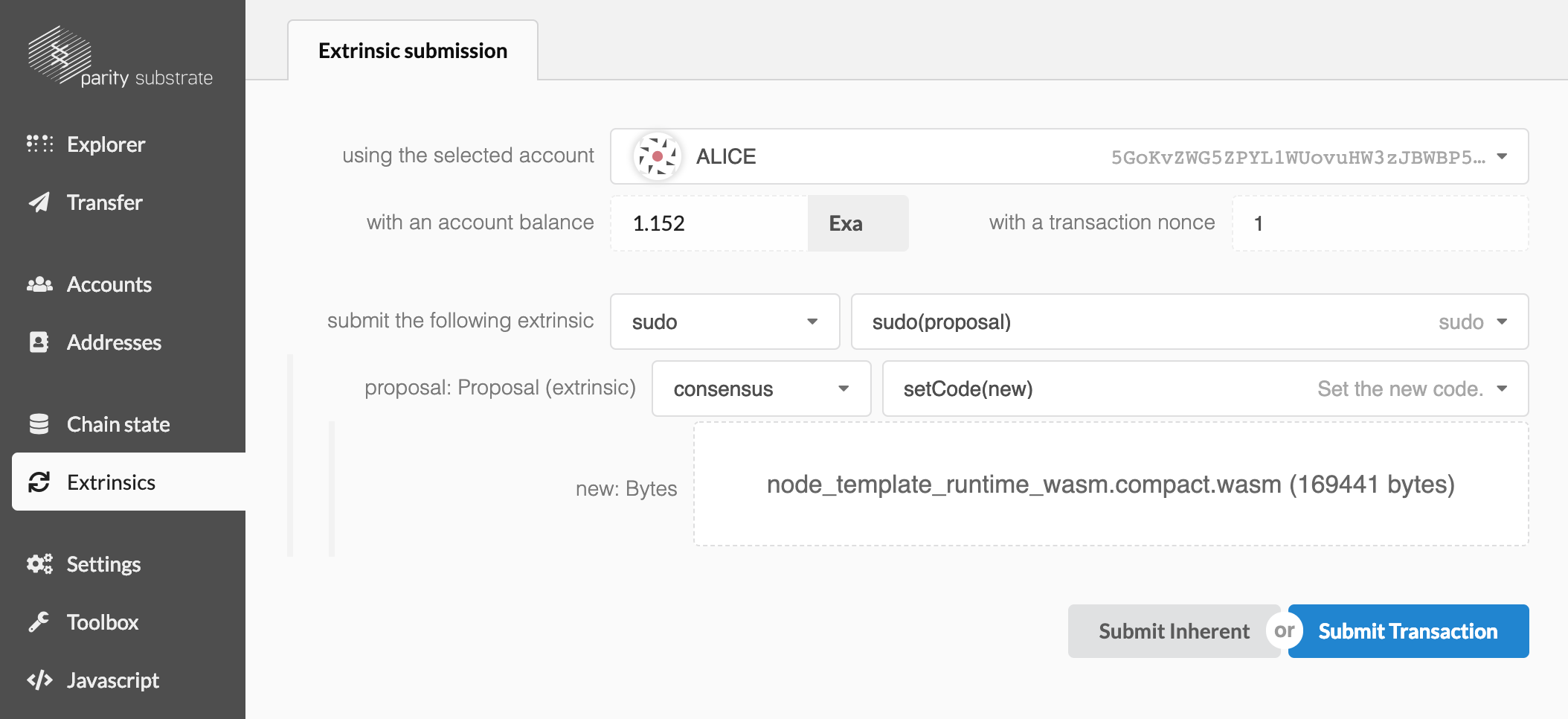 - We are making a transaction using “Alice”, who has been set as the Sudo key.