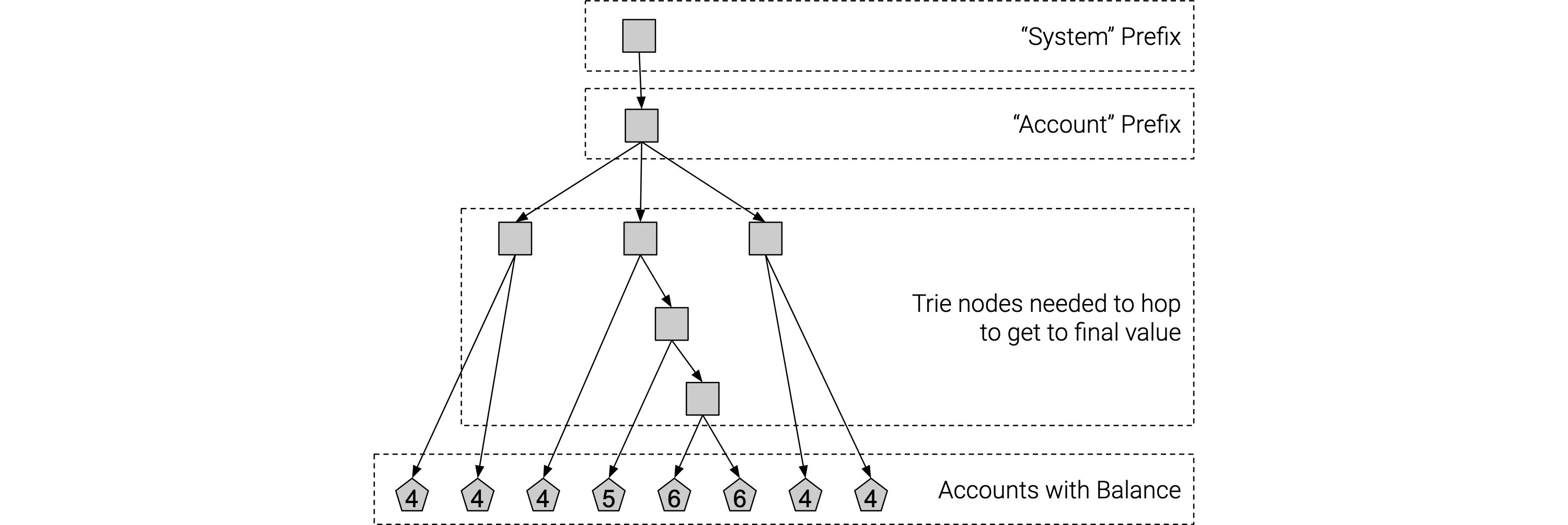 You can see in this illustration, most accounts take only 4 hops to get access to the final value, but some in the middle can take up to 6 hops. This is a very tame example of an “unbalanced trie”, but when actually attacking a system, you can imagine introducing many extra additional hops to access some user accounts.