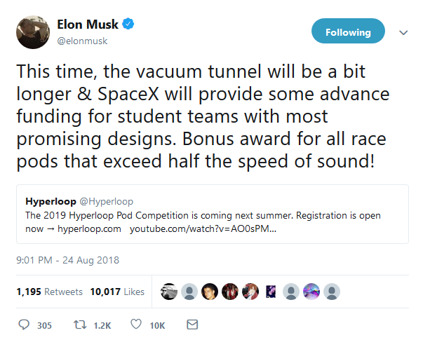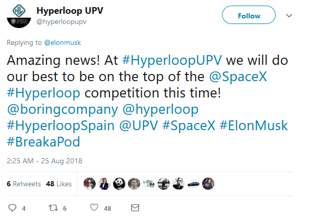 "Amazing news! At #HyperloopUPV we will do our best to be on the top of the @SpaceX #Hyperloop competition this time! @boringcompany @hyperloop